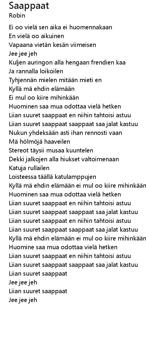 | [02:52.20] | Liian suuret saappaat saappaat saa jalat kastuu |