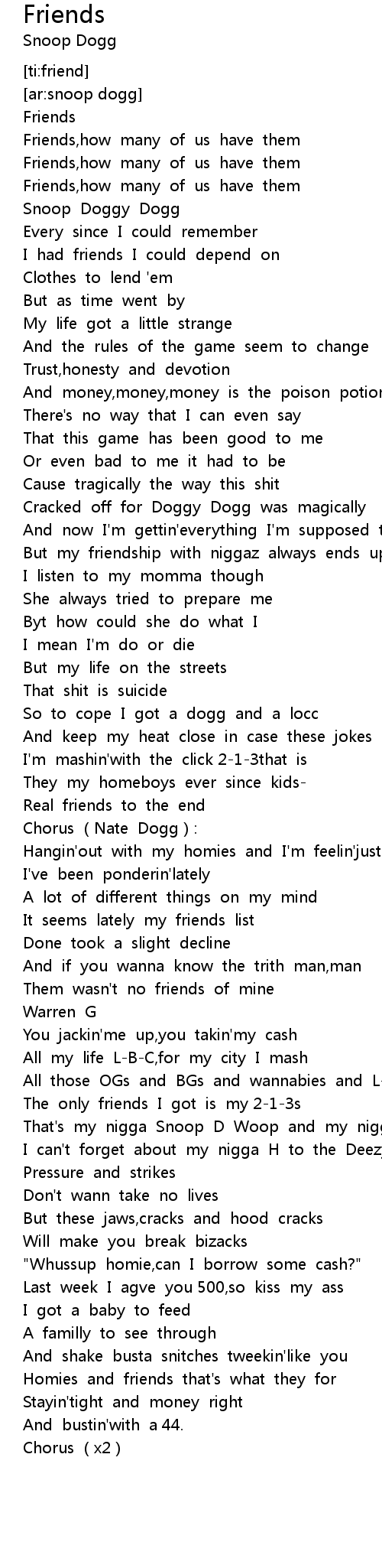 | [01:07.83] | But my friendship with niggaz always ends up as bulshit |