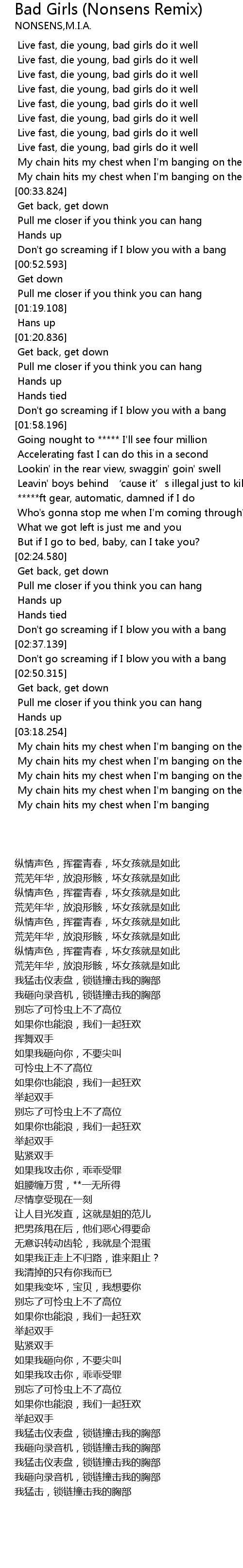 | [00:10.883] | Live fast, die young, bad girls do it well |