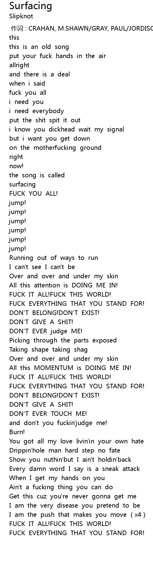 | [00:00.00] | 作词 : CRAHAN, M.SHAWN/GRAY, PAUL/JORDISON, NATHAN/TAYLOR, COREY |
