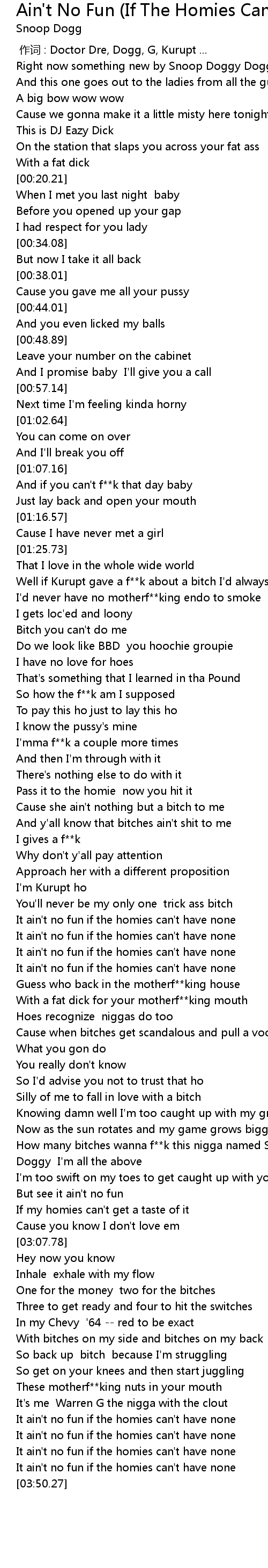 | [02:55.76] | How many bitches wanna f**k this nigga named Snoop |