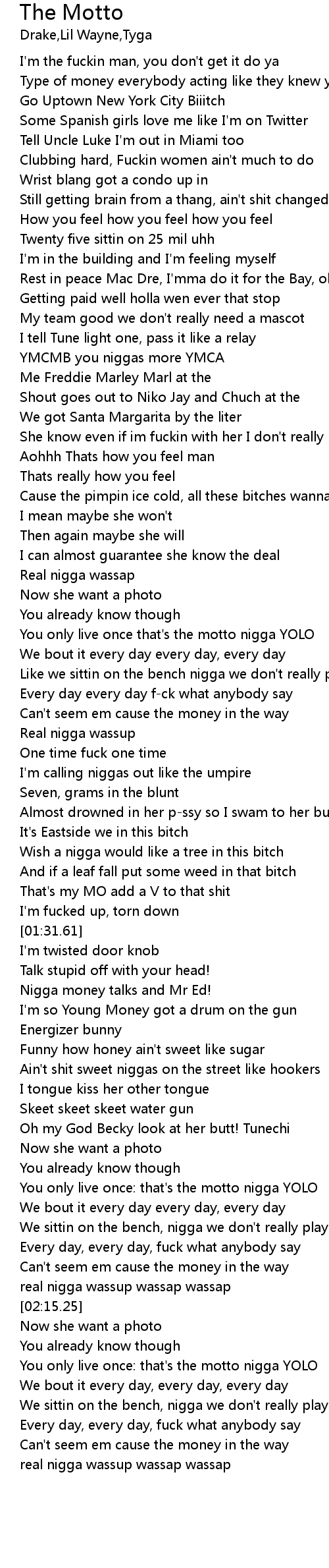 | [02:24.50] | You only live once: that's the motto nigga YOLO |
