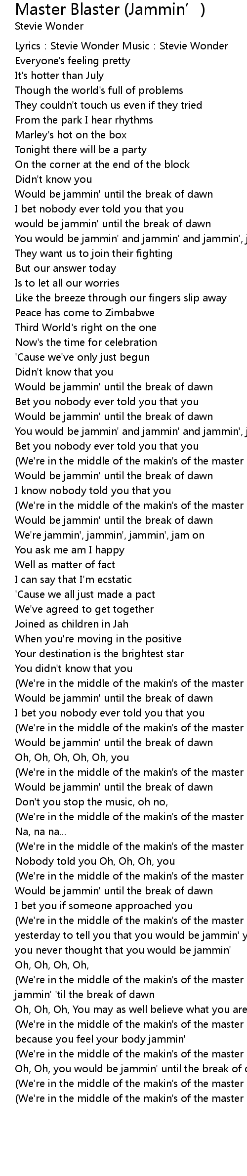 | (We're in the middle of the makin's of the master blaster jammin') | |