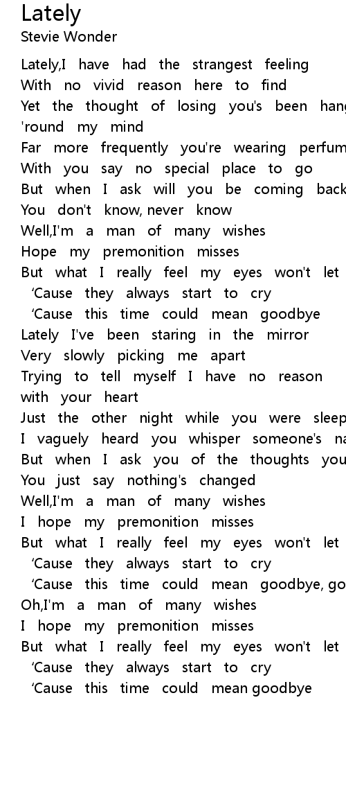 | [00:12.33] | Lately, I have had the strangest feeling |