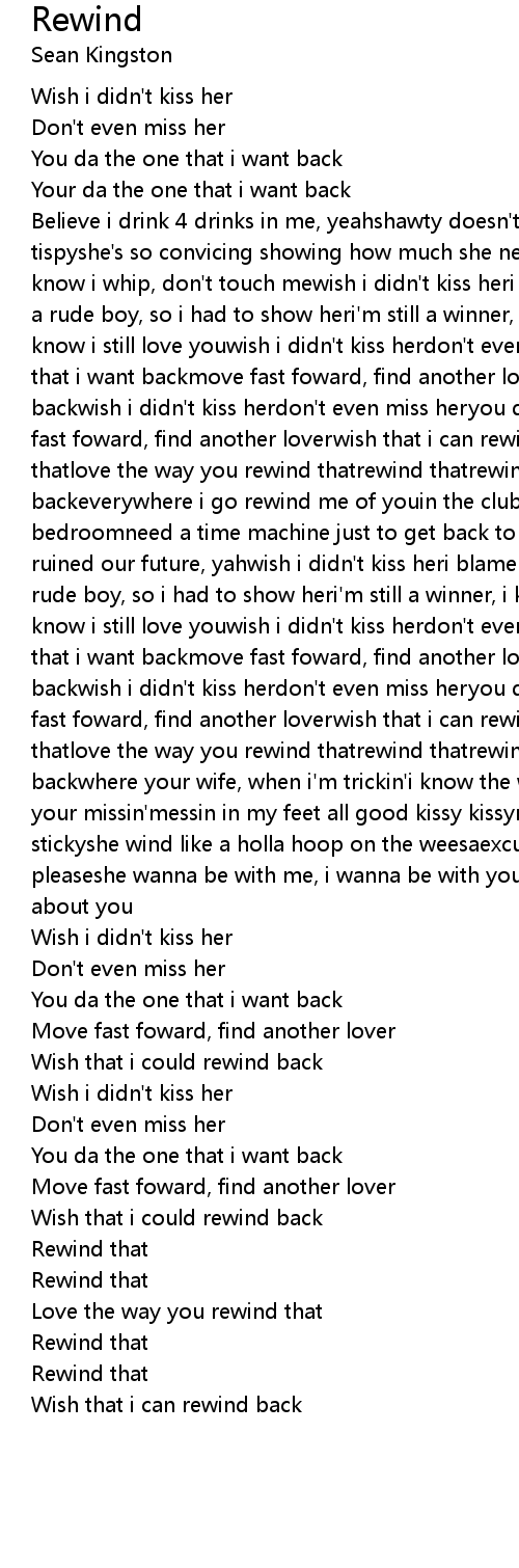 Believe i drink 4 drinks in me, yeahshawty doesn't know me while i'm getting tispyshe's so convicing showing how much she needs me, woahi'm inperfect so you know i whip, don't touch mewish i didn't kiss heri blame it on the liquorim just a rude boy, so i had to show heri'm still a winner, i know that i'ma sinnerbut i know i still love youwish i didn't kiss herdon't even miss heryou da the one that i want backmove fast foward, find another loverwish that i could rewind backwish i didn't kiss herdon't even miss heryou da the one that i want backmove fast foward, find another loverwish that i can rewind backrewind thatrewind thatlove the way you rewind thatrewind thatrewind thatwish that i can rewind backeverywhere i go rewind me of youin the club, in the car, in the bar, or the bedroomneed a time machine just to get back to you,cause i know what i did, just ruined our future, yahwish i didn't kiss heri blame it on the liquorim just a rude boy, so i had to show heri'm still a winner, i know that i'ma sinnerbut i know i still love youwish i didn't kiss herdon't even miss heryou da the one that i want backmove fast foward, find another loverwish that i could rewind backwish i didn't kiss herdon't even miss heryou da the one that i want backmove fast foward, find another loverwish that i can rewind backrewind thatrewind thatlove the way you rewind thatrewind thatrewind thatwish that i can rewind backwhere your wife, when i'm trickin'i know the way to crib it, i know whats your missin'messin in my feet all good kissy kissyman up man you know i'm sticky stickyshe wind like a holla hoop on the weesaexcuse me girl can i take your pleaseshe wanna be with me, i wanna be with younow i'm in the bedroom thinking about you