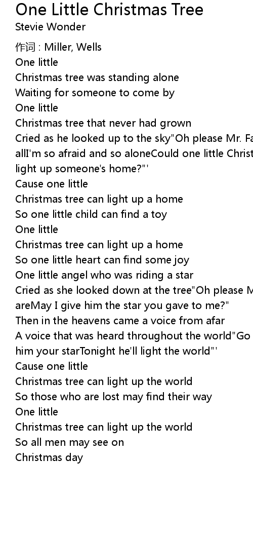 | Cried as he looked up to the sky" Oh please Mr. Father Tree, the tallest of allI' m so afraid and so aloneCould one little Christmas treeSo tiny and small light up someone' s home?"' | |