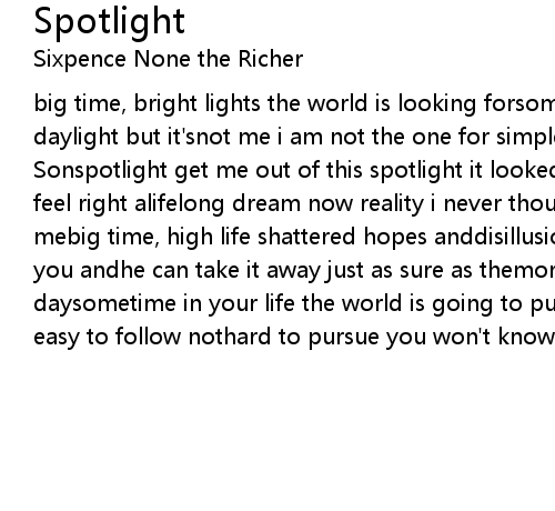 | Sonspotlight get me out of this spotlight it lookedokay but somehow it doesn't feel right alifelong dream now reality i never thoughtthat it could happen to mebig time, high life shattered hopes anddisillusioned insight he can give it to you andhe can take it away just as sure as themorning is the start of the daysometime in your life the world is going to putyou under the spotlight it's easy to follow nothard to pursue you won't know that it happened to you |
