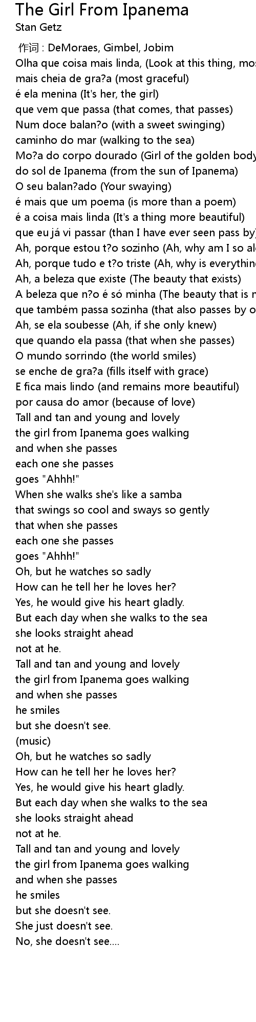 | [00:25.360] | do sol de Ipanema (from the sun of Ipanema) |