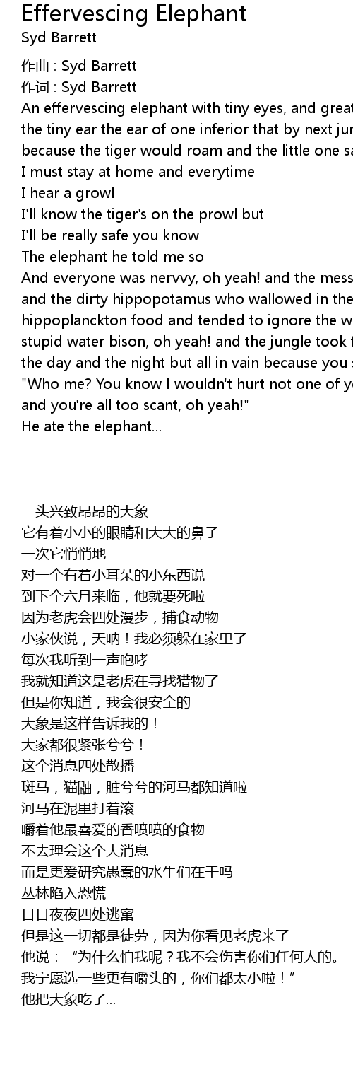 | An effervescing elephant with tiny eyes, and great big trunk once whispered to the tiny ear the ear of one inferior that by next june he'd die, oh yeah! because the tiger would roam and the little one said oh my goodness | |