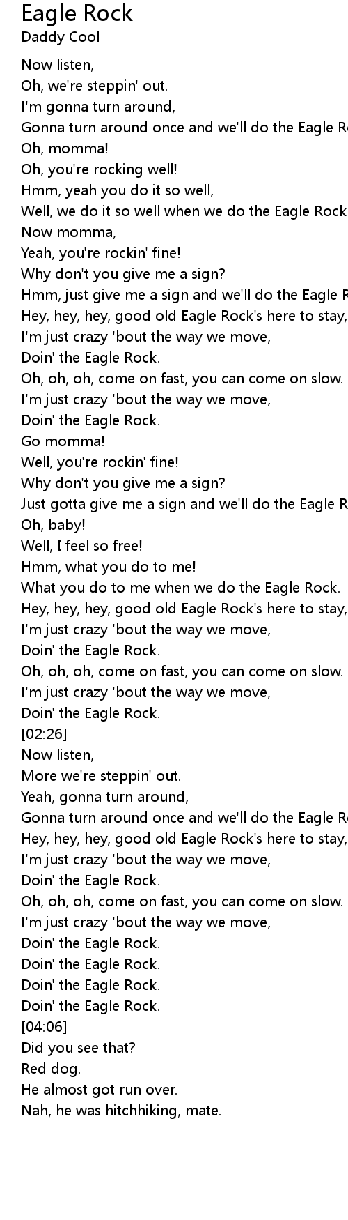 Hey, hey, hey, good old Eagle Rock's here to stay, |