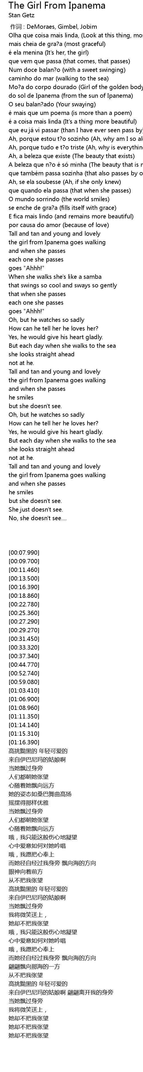 | [00:00.00] | 作词 : DeMoraes, Gimbel, Jobim |