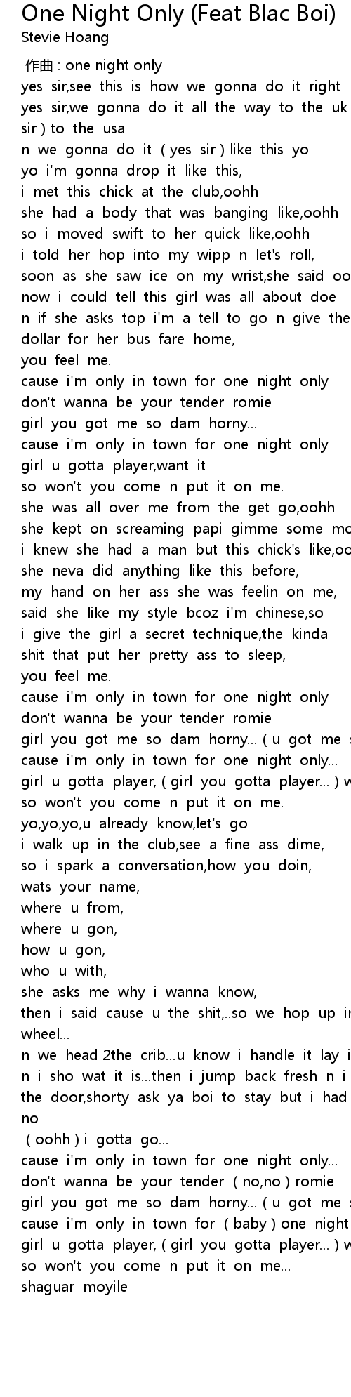 | [02:26.441] | cause i' m only in town for baby one night only |
