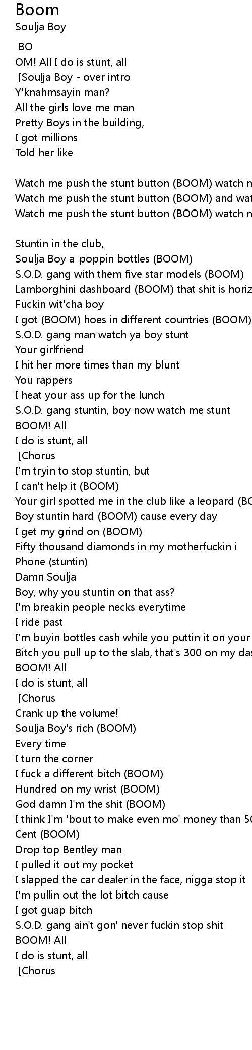 Watch me push the stunt button (BOOM) watch me watch me stunt [Soulja Boy] |