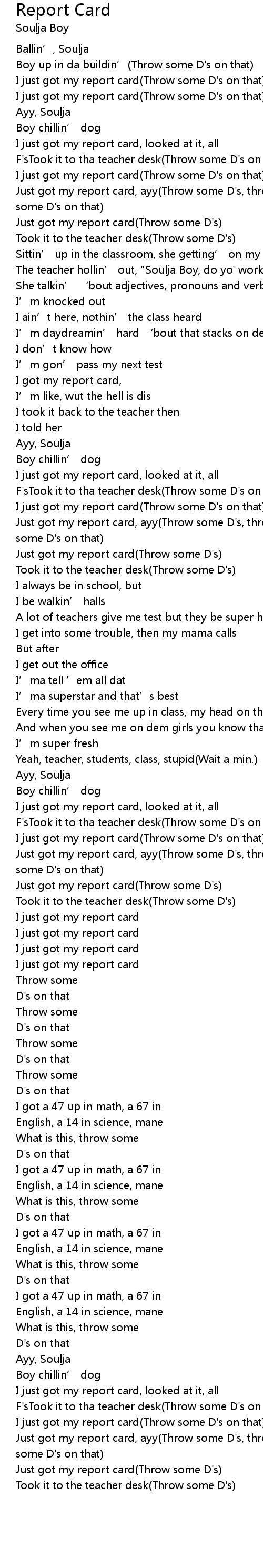 | Just got my report card, ayy(Throw some D's, throw some D's)(Throw some throw some D's on that) | |