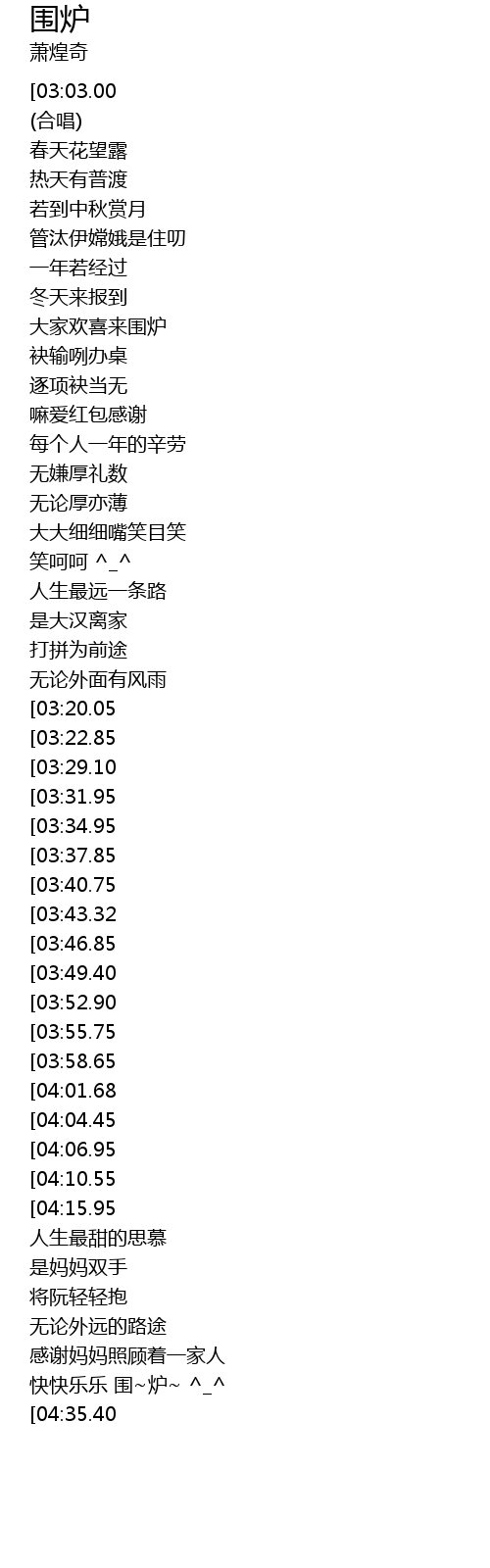 | [02:32.40][04:15.95] | 人人拢爱 围~炉~ |