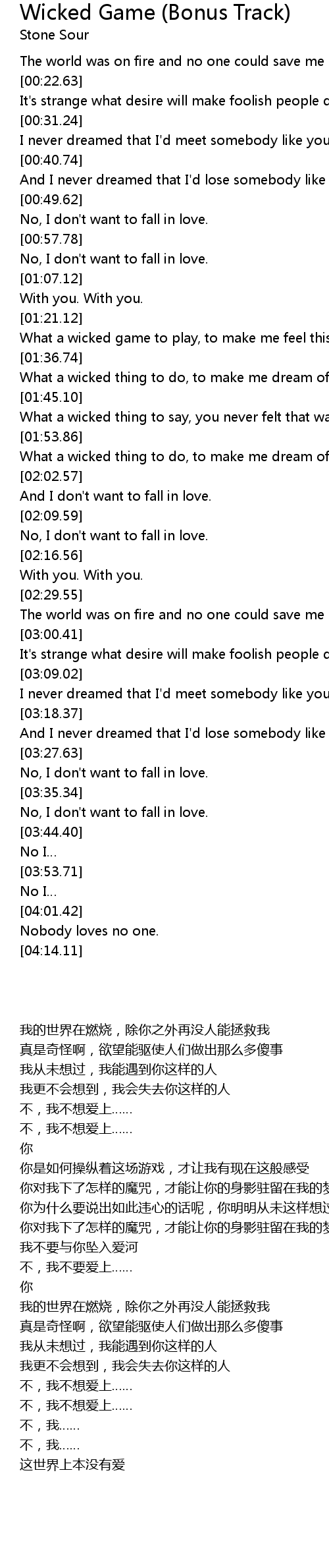 | [01:29.54] | What a wicked game to play, to make me feel this way. |