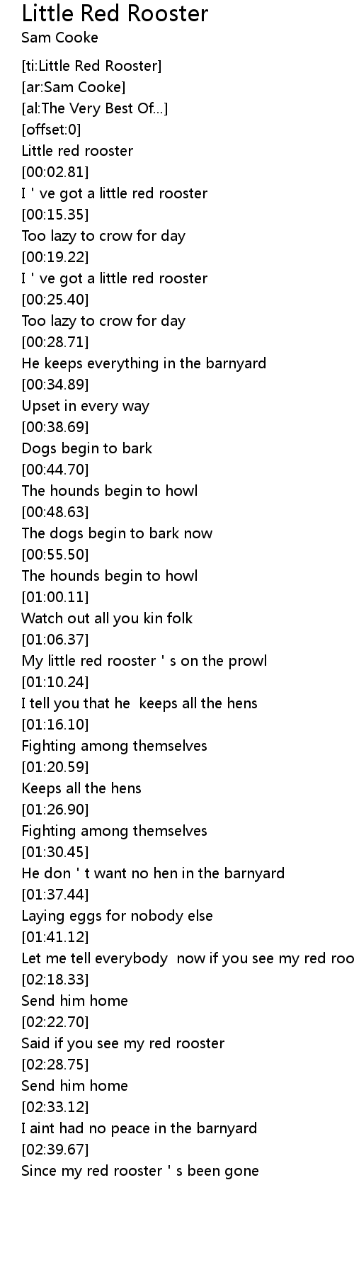 | [02:13.15] | Let me tell everybody now if you see my red rooster |