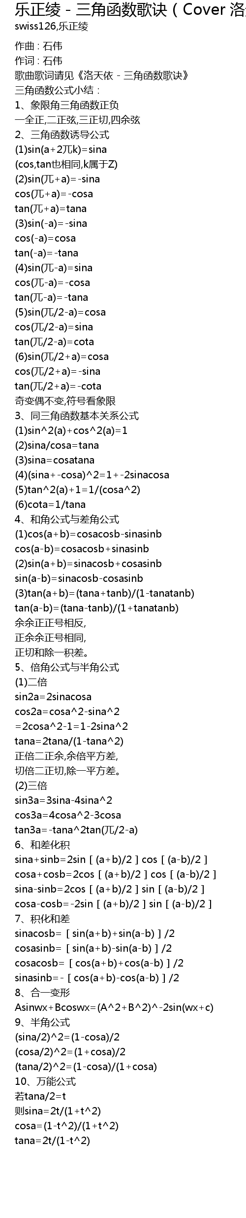 | 歌曲歌词请见《洛天依 - 三角函数歌诀》 | |