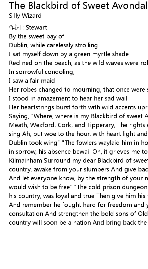 | Saying, "Where, where is my Blackbird of sweet Avondale?" "In the fair counties Meath, Wexford, Cork, and Tipperary, The rights of Old Ireland, my Blackbird did sing Ah, but woe to the hour, with heart light and airy Away from my arms, to Dublin took wing" "The fowlers waylaid him in hopes to ensnare him While I here in sorrow, his absence bewail Oh, it grieves me to think that the walls of Kilmainham Surround my dear Blackbird of sweet Avondale" "Oh, Ireland, my country, awake from your slumbers And give back my Blackbird, so dear unto me And let everyone know, by the strength of your numbers That we, as a nation, would wish to be free" "The cold prison dungeons is no habitation For one, to his country, was loyal and true Then give him his freedom, without hesitation And remember he fought hard for freedom and you" "Oh, Heaven, give ear to my consultation And strengthen the bold sons of Old Granuaile And God grant that my country will soon be a nation And bring back the Blackbird to sweet Avondale" |