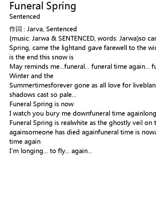 | Funeral Spring is realwhite as the ghostly veil on the groundfuneral time againsomeone has died againfuneral time is nowand you bury me down belowfuneral time again | |