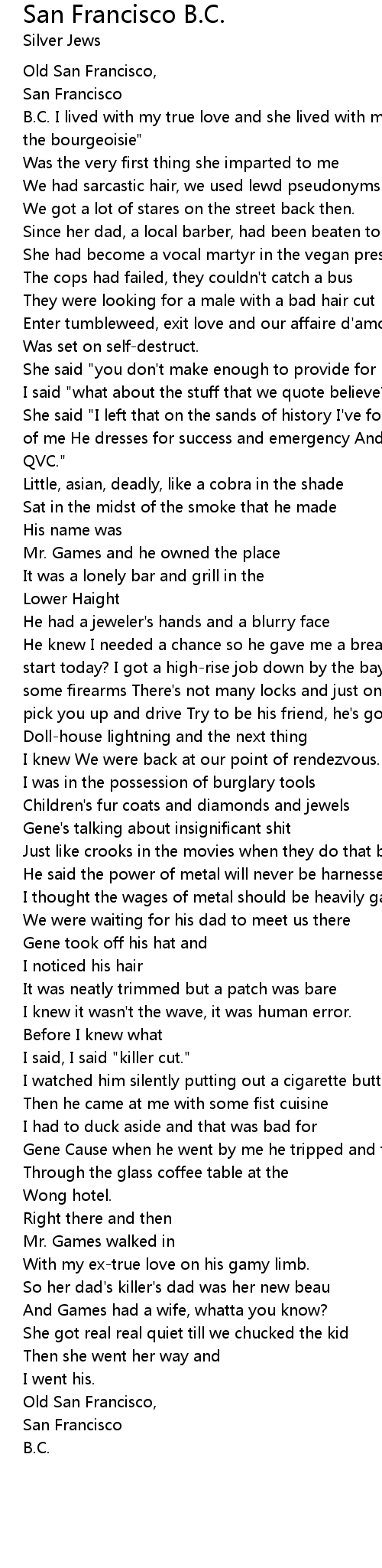 He knew I needed a chance so he gave me a break. "If I hire you now, can you start today? I got a high-rise job down by the bay. Just a couple of rocks and some firearms There's not many locks and just one alarm My step-son Gene will pick you up and drive Try to be his friend, he's got a friendly side." |