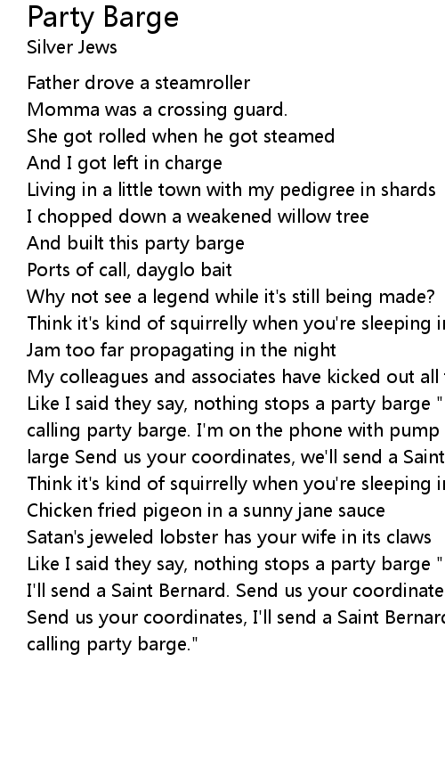 Like I said they say, nothing stops a party barge "This is lake directory, calling party barge. I'm on the phone with pump control, they say you are at large Send us your coordinates, we'll send a Saint Bernard" |