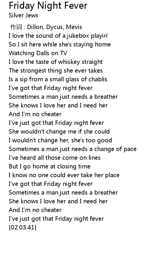 | [00:57.16] | I've just got that Friday night fever |