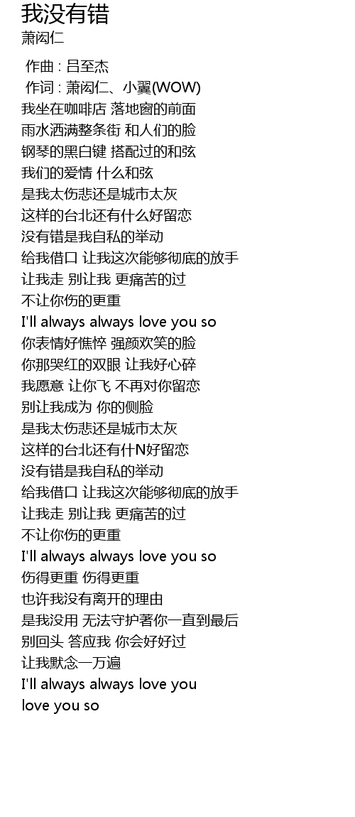| [00:01.00] | 作词 : 萧闳仁、小翼(WOW) |