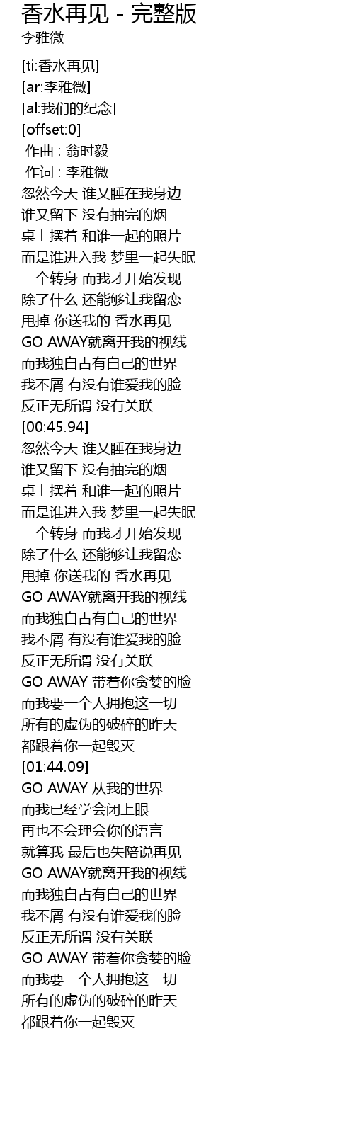 | [01:30.06] | GO AWAY 带着你贪婪的脸 |