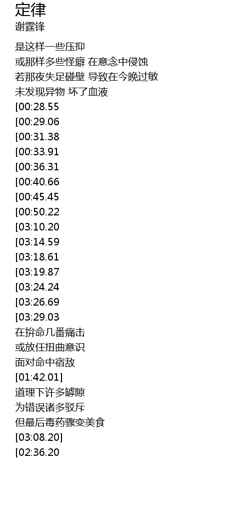 | [03:29.52][03:10.20][02:12.52][00:50.79] | 有定律 没定律 多少道理 |