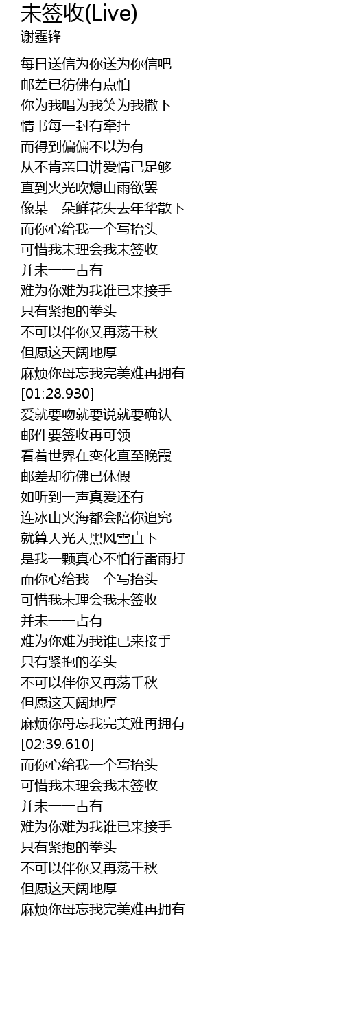 | [01:35.259] | yóu jiàn yào qiān shōu zài kě lǐng |