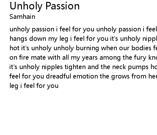 | unholy passion i feel for you unholy passion i feel for you this thing that hangs down my leg i feel for you it's unholy nipples tighten and the neck pumps hot it's unholy unholy burning when our bodies feel the flame encircling snake on fire mate with all my years among the fury know the burning is here for you it's unholy nipples tighten and the neck pumps hot it's unholy unholy passion i feel for you dreadful emotion the grows from here this thing that hangs down my leg i feel for you |