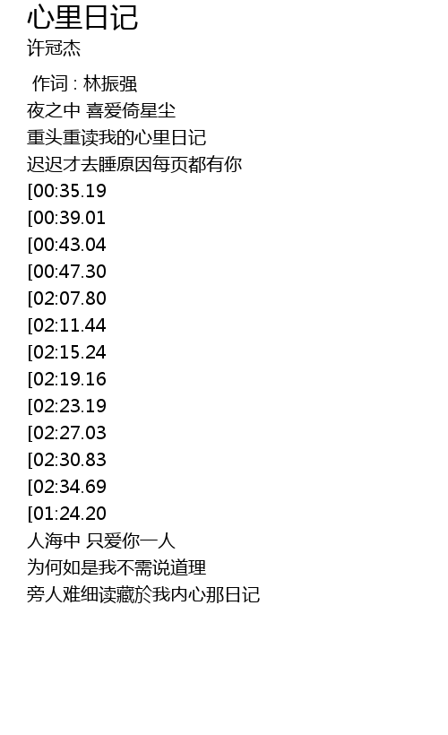 | [01:44.58] | 旁人难细读藏於我内心那日记 |