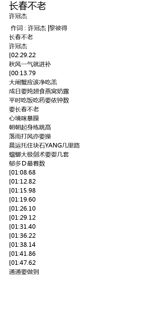 | [02:33.24][02:29.22][02:07.54][01:45.88][01:24.17][01:02.66][00:48.02][00:40.93][00:15.53][00:08.35] | 要长春不老 |