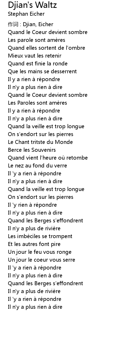 | 作词 : Djian, Eicher | |