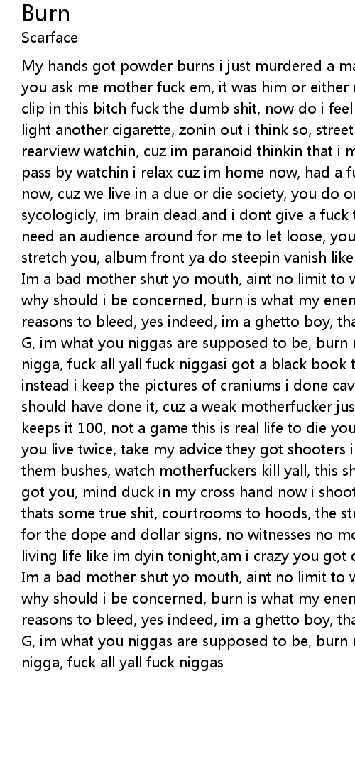 | Im a bad mother shut yo mouth, aint no limit to what i earn, if it aint money why should i be concerned, burn is what my enemies do, just like weed 223 reasons to bleed, yes indeed, im a ghetto boy, thats right everybody knows im a | |