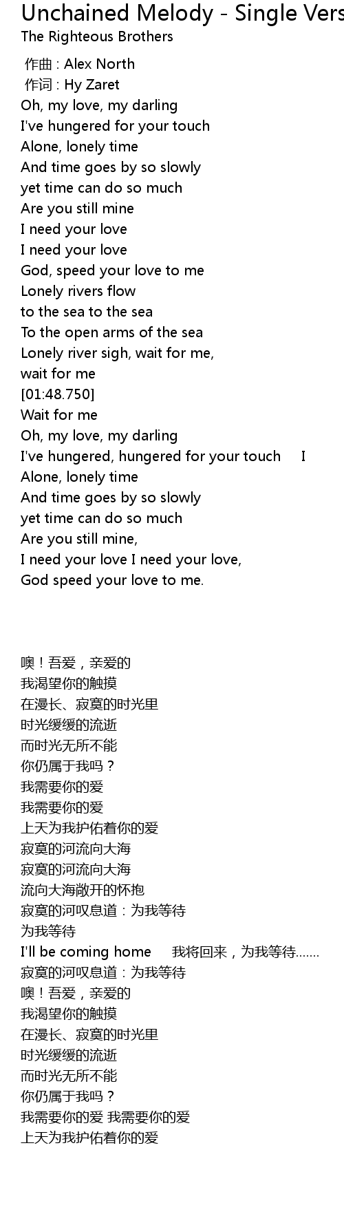 | [01:41.979] | Lonely river sigh, wait for me, |