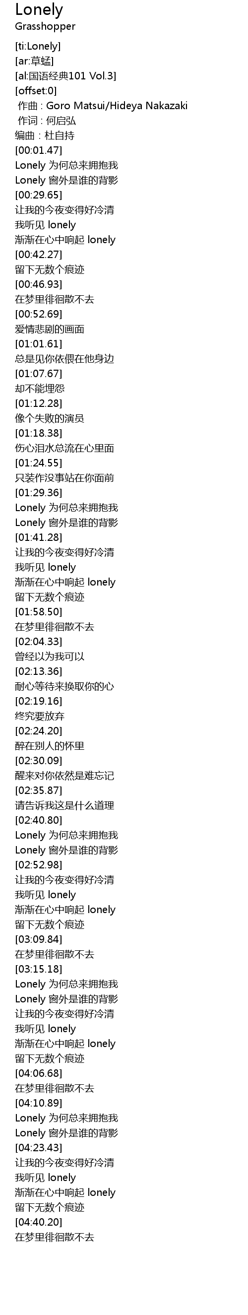 | [01:31.04] | Lonely 为何总来拥抱我 |