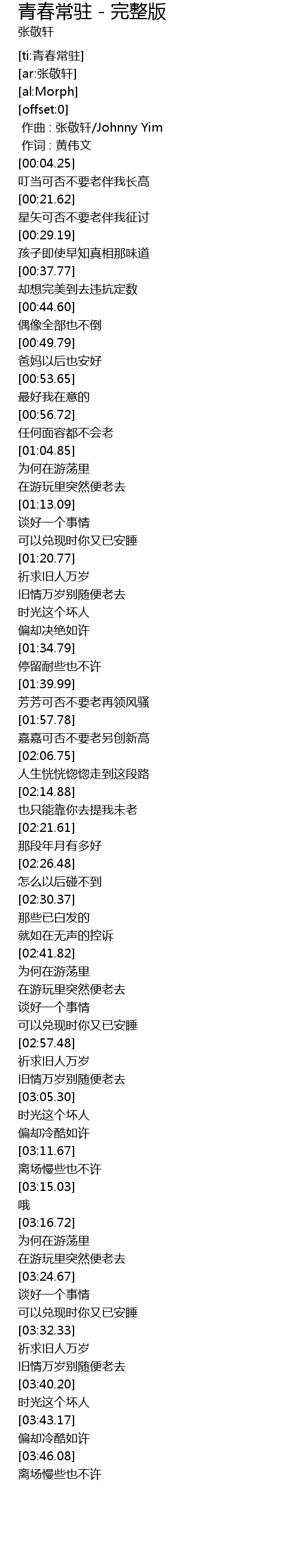 | [00:00.00] | zuò qǔ : zhāng jìng xuān Johnny Yim |