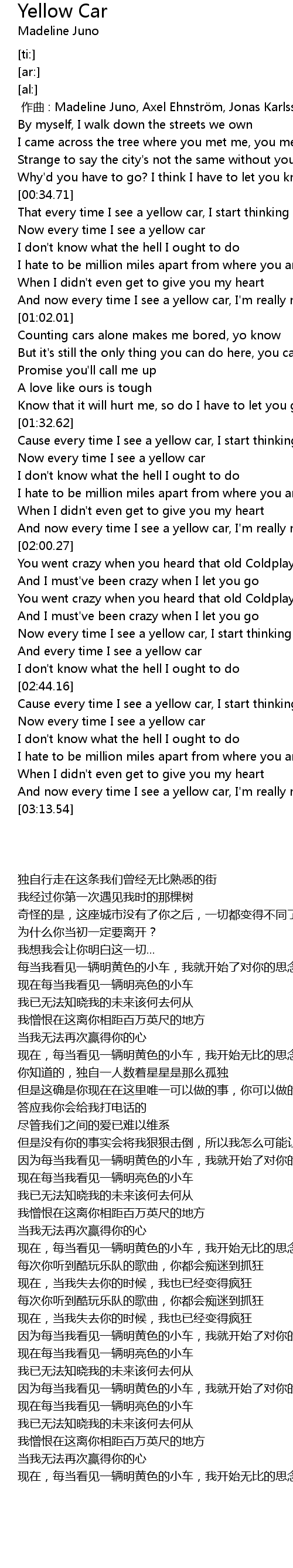 | [02:31.45] | Now every time I see a yellow car, I start thinking about you |