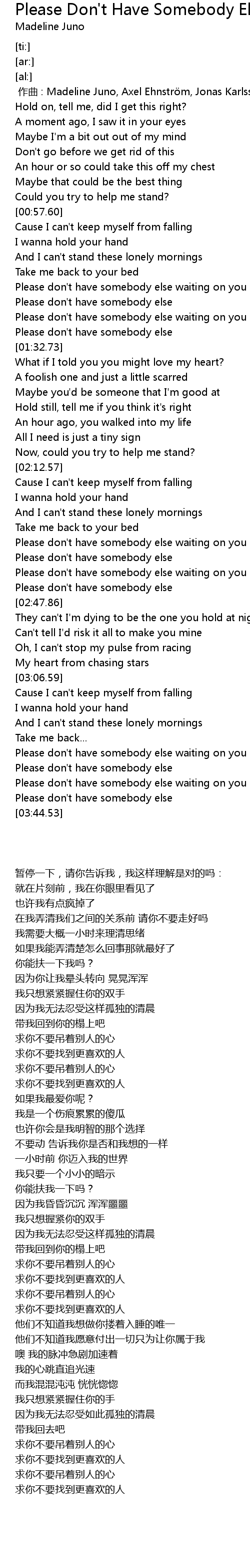 | [02:30.69] | Please don' t have somebody else waiting on you |