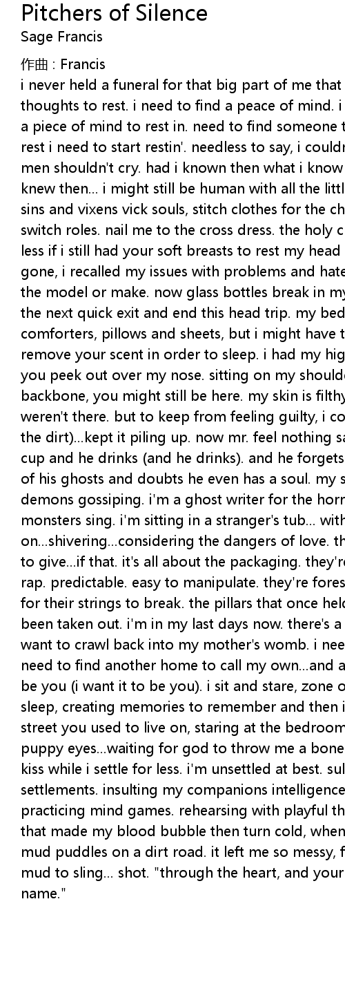 | i never held a funeral for that big part of me that died. i need to put these thoughts to rest. i need to find a peace of mind. i need to piece my mind, find a piece of mind to rest in. need to find someone to confide in, and with the rest i need to start restin'. needless to say, i couldn' t hide. fifteen grown men shouldn' t cry. had i known then what i know now. had i thought now what i knew then... i might still be human with all the little stupid fixins. as i fix sins and vixens vick souls, stitch clothes for the characters they play then switch roles. nail me to the cross dress. the holy cloth costs less. i' d toss less if i still had your soft breasts to rest my head on. since you' ve been gone, i recalled my issues with problems and hate but i can' t exactly remember the model or make. now glass bottles break in my death grip. i' m about to take the next quick exit and end this head trip. my bed' s stripped of its blankets, comforters, pillows and sheets, but i might have to peel off all my skin to remove your scent in order to sleep. i had my highs and lows. when on top, i let you peek out over my nose. sitting on my shoulders and i suppose if i had a backbone, you might still be here. my skin is filthy... from my lows when you weren' t there. but to keep from feeling guilty, i collected the dirt collected the dirt... kept it piling up. now mr. feel nothing saves his tears inside of a cup and he drinks and he drinks. and he forgets that he' s an asshole. jealous of his ghosts and doubts he even has a soul. my secret pleasures have my inner demons gossiping. i' m a ghost writer for the horrorcore lyrics my personal monsters sing. i' m sitting in a stranger' s tub... with all my clothes on... shivering... considering the dangers of love. they get half of what i have to give... if that. it' s all about the packaging. they' re distracted by the gift rap. predictable. easy to manipulate. they' re foreshadow puppets and i' m waiting for their strings to break. the pillars that once held up my halfway house have been taken out. i' m in my last days now. there' s a change coming soon. i just want to crawl back into my mother' s womb. i need a comfort zone, but obviously i need to find another home to call my own... and always return to and i want it to be you i want it to be you. i sit and stare, zone out, think a lot and never sleep, creating memories to remember and then i forget to eat. went to the street you used to live on, staring at the bedroom window of your old home with puppy eyes... waiting for god to throw me a bone. i' d settle for one more goodbye kiss while i settle for less. i' m unsettled at best. sulking while abandoning settlements. insulting my companions intelligence... conversing with baby talk. practicing mind games. rehearsing with playful thought. it' s the way we fought that made my blood bubble then turn cold, when you made me walk through rain and mud puddles on a dirt road. it left me so messy, forget me... not. i' ve got more mud to sling... shot. " through the heart, and your to blame, you give love a bad name." |