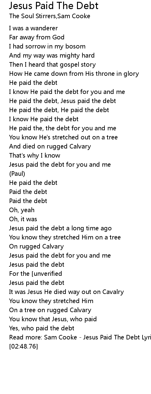 Read more: Sam Cooke - Jesus Paid The Debt Lyrics | MetroLyrics |