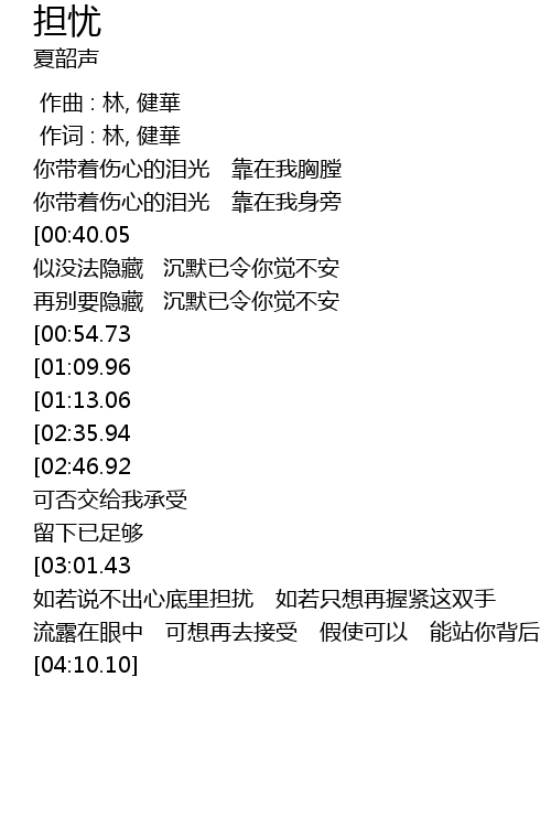 | [02:00.51][00:40.05] | 如像有话想讲未讲 你放任高声将泪淌 |