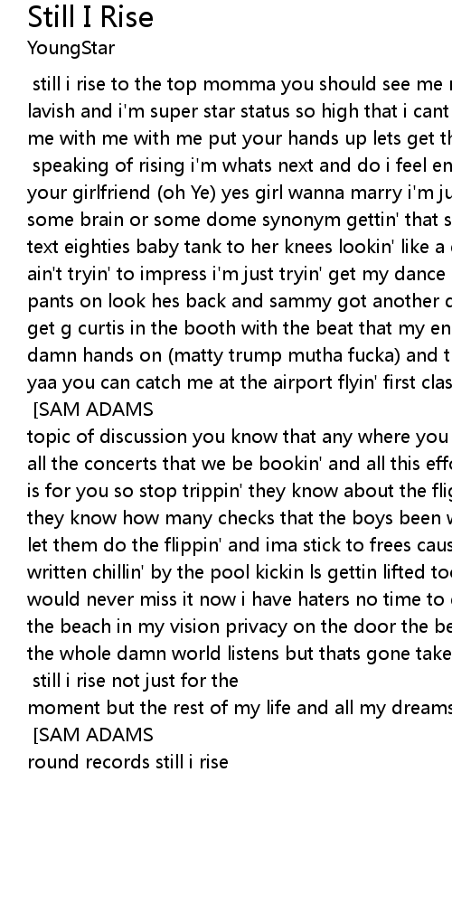 [Hook: G CURTIS] still i rise to the top momma you should see me now lights so lavish and i'm super star status so high that i cant come down so if you're with me with me with me put your hands up lets get this money money and smile for the camera [SAM ADAMS] speaking of rising i'm whats next and do i feel entitled to your girlfriend (oh Ye) yes girl wanna marry i'm just looking for some sex or some brain or some dome synonym gettin' that small girl skinnier than anyone i text eighties baby tank to her knees lookin' like a dress others on the jack i ain't tryin' to impress i'm just tryin' get my dance on come back to a girl no pants on look hes back and sammy got another dance song had to put my mans on, get g curtis in the booth with the beat that my engineer matty could get his damn hands on (matty trump mutha fucka) and then my life was what i planned for yaa you can catch me at the airport flyin' first class know i'm on the grand tour never forgettin' to smile for the camera [HOOK: G CURTIS] [SAM ADAMS] [?] topic of discussion you know that any where you go they'll be lookin' despite all the concerts that we be bookin' and all this effort that i be puttin' down is for you so stop trippin' they know about the flights and resorts we hittin' they know how many checks that the boys been writtin' so stick to the dive and let them do the flippin' and ima stick to frees cause they better than my written chillin' by the pool kickin ls gettin lifted took a chance so i knew i would never miss it now i have haters no time to dismiss them wakin up pos see the beach in my vision privacy on the door the beats is admission wont stop till the whole damn world listens but thats gone take some time either you pop or you drop know the boy gone shine [HOOK: G CURTIS] still i rise not just for the moment but the rest of my life and all my dreams they constantly get turned into reality [HOOK: G CURTIS] [SAM ADAMS] sammy adams g curtis first round first round records still i rise