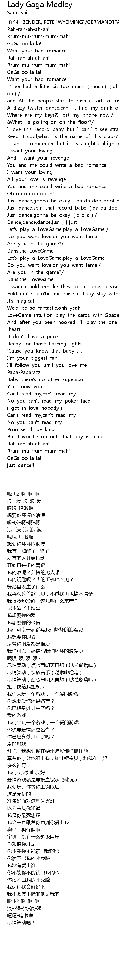 | [00:00.00] | 作词 : BENDER, PETE "WYOMING"/GERMANOTTA, STEFANI/RILEY, TAJA |