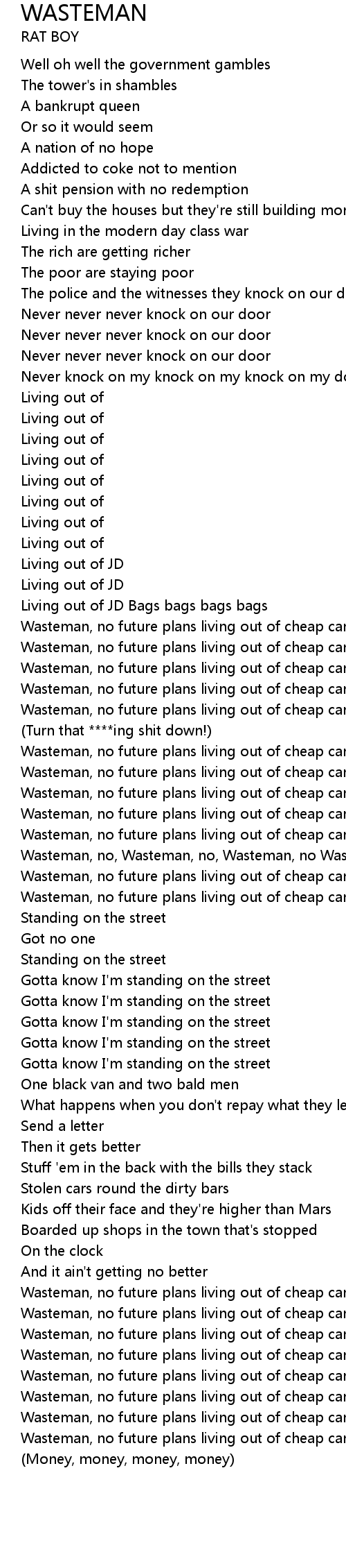 | [01:48.260] | Wasteman, no future plans living out of cheap cans |