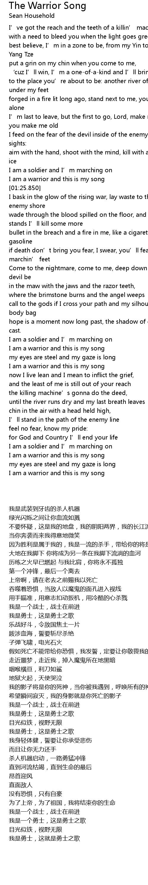 | [01:26.850] | I bask in the glow of the rising war, lay waste to the ground of an enemy shore |