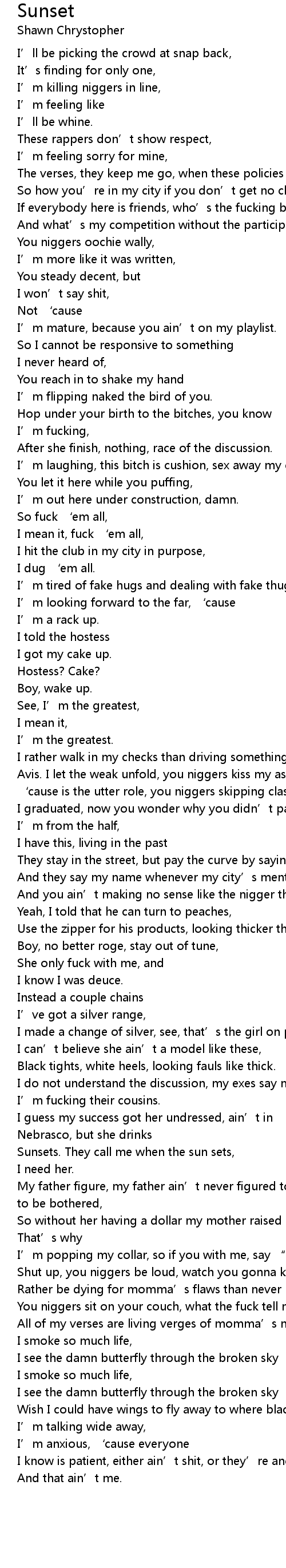 | Avis. I let the weak unfold, you niggers kiss my ass, boy, cheek and hole. ‘cause is the utter role, you niggers skipping class, | |