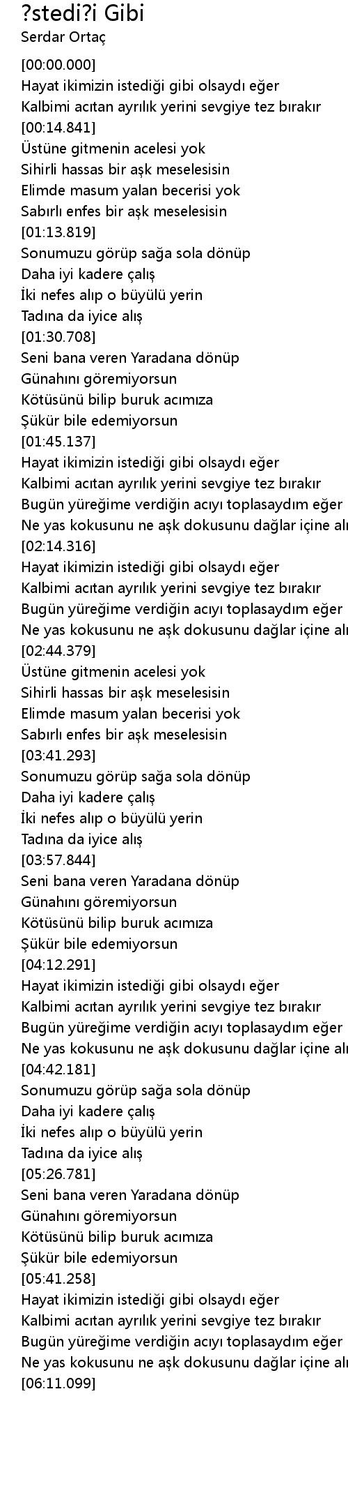 | [00:01.070] | Hayat ikimizin istedi i gibi olsayd e er |